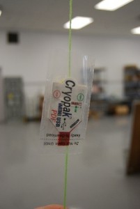 Finally, secure the data loggers in place. Make sure they will stay put during the study. Attach them to stationary objects such as shelves, or racks. Please refer to the pictures below for suggestions. In case of large empty spaces, you can install data loggers on ropes hanging from the ceiling.